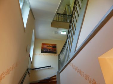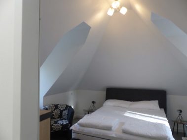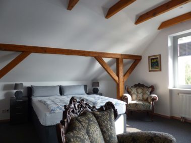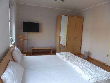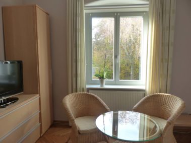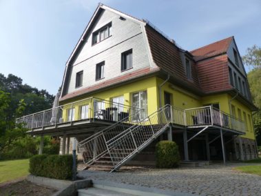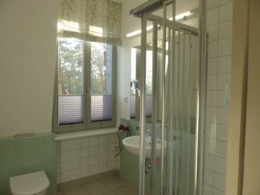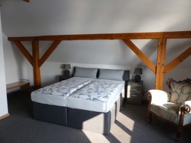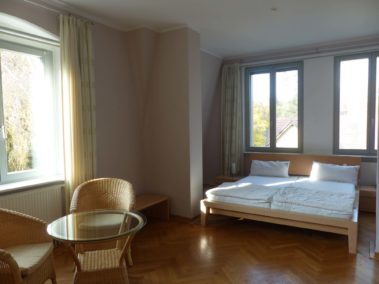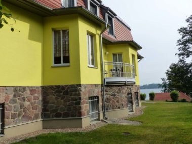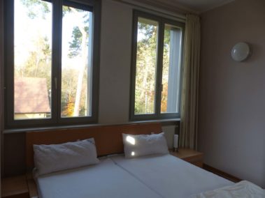 Das große Ferienhaus hat 8 Zimmer (2 Einzel-, 5 Doppel-, 1 Dreibettzimmer sowie ein Gemeinschaftswohnzimmer mit Fernseher und Blick auf dem Scharmützelsee und einem Zugang zur Terrasse.